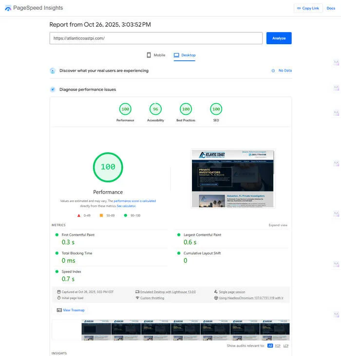 - Fast Loading Times: Optimized performance ensures users have a smooth browsing experience. The Atlantic Coast PI website scores a perfect 100/100 on Google Page Speed Insights.